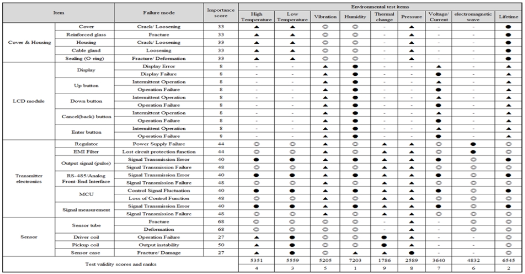 The QFD analysis established a relationship between user and classification requirements and technical-design items, prioritizing environmental-test factors. The humidity test had the highest importance, followed by the lifetime, low-temperature, and vibration tests. This reflected the combined influence of humidity, temperature variation, and vibration as the major factors affecting long-term reliability. Humidity was identified as the primary cause of insulation deterioration and signal instability, emphasizing the need for waterproofing and moisture-resistant design improvements.
